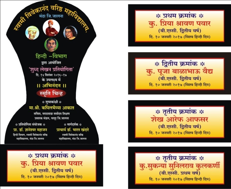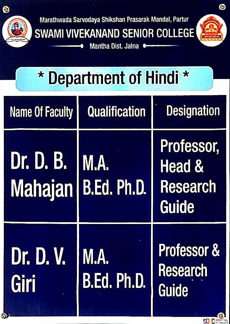 The department of Hindi, established in 1993,under the Swami Vivekanand Senior College, Mantha Dist – Jalna. Offers common course for the Students of B. A. /B.Sc./B.Com but optional Hindi subject for B. A. Faculty. Two Faculty members are currently teaching to B. A. /B.Sc./B.Com. of the first and second year to second language hindi and optional hindi subject teaching to B. A. I, II and III year. Our thrust has always been on the student attributes and on holistic development of the students. So that they can display multiple skills in hindi language.